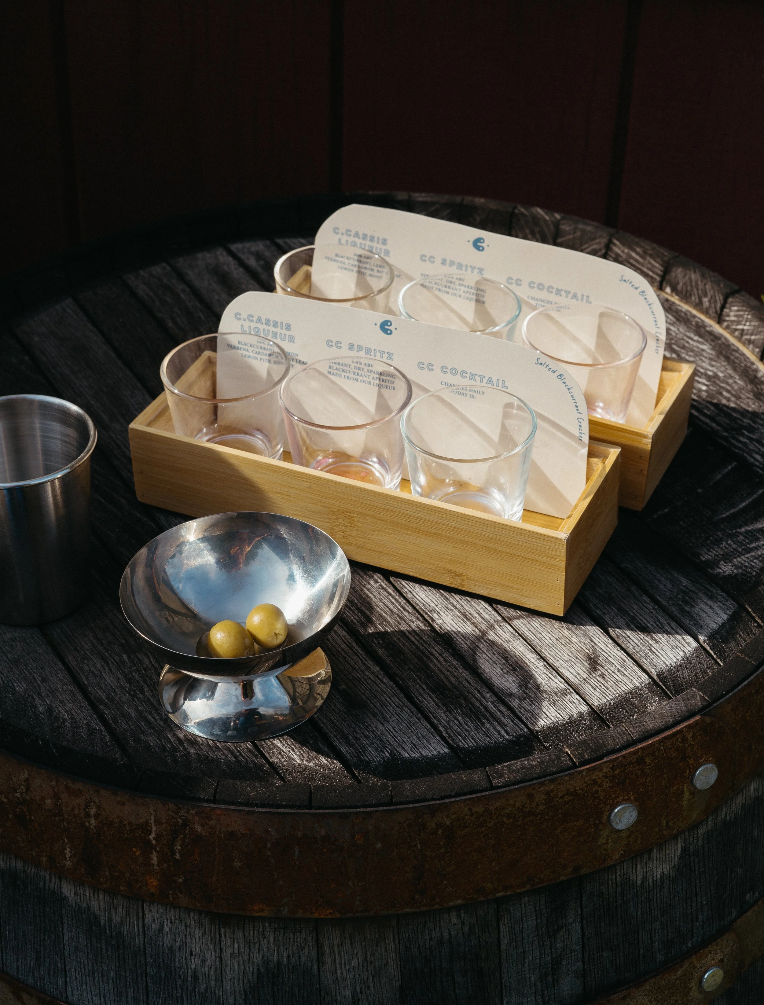 C. Cassis is our modern take on the classic blackcurrant liqueur. We start by fermenting whole blackcurrants like wine, then lightly fortify and infuse with botanicals. The result is a bright, refreshingly tart aperitif — subtly herbal, easy to mix, and endlessly versatile.