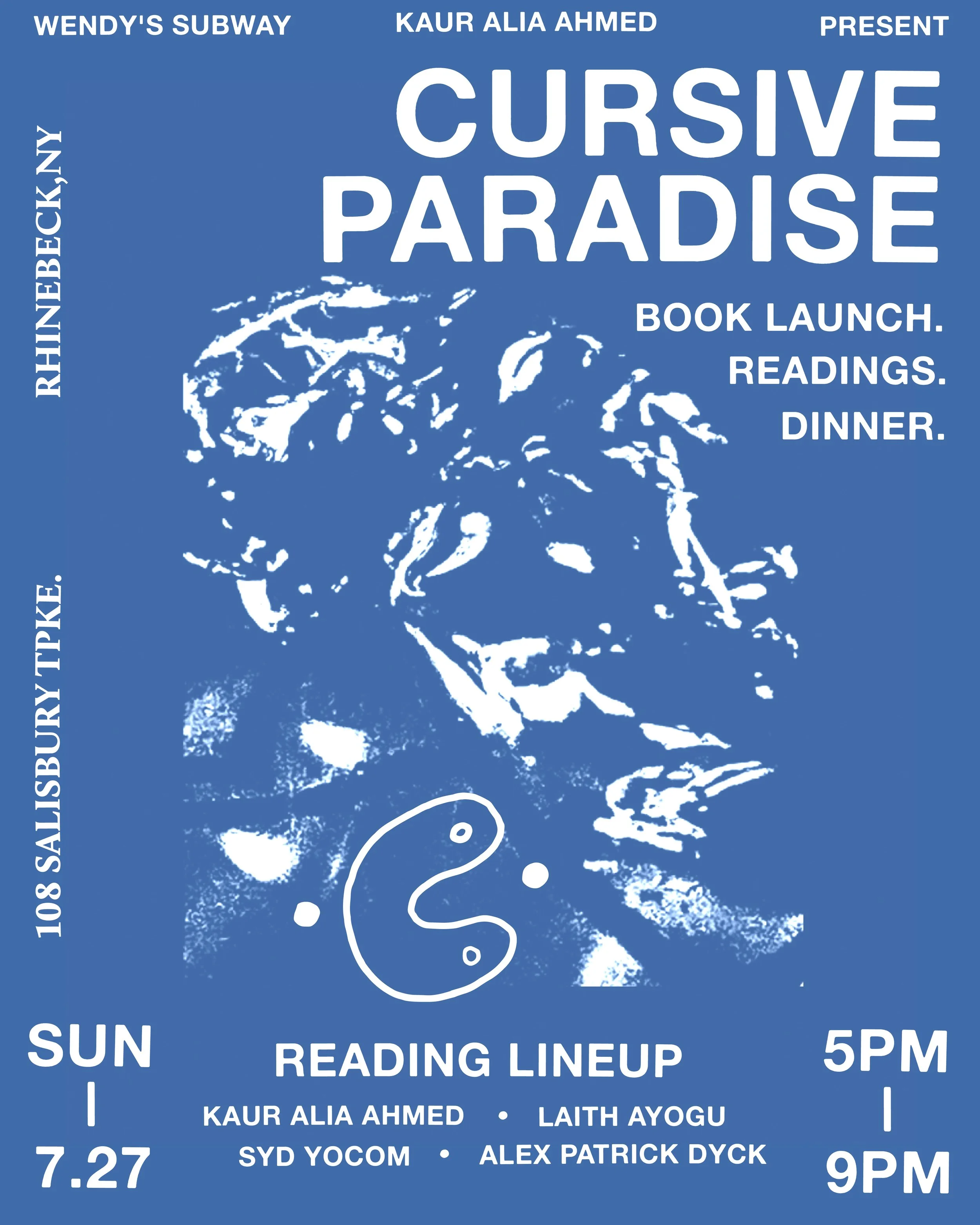 Kaur Alia Ahmed is an artist, writer, and cook living in New York. He is interested in destabilizing language, handling it in a way akin to his use of materials such as ink, skin, light. His work has been presented at Interstate Projects, 77 Mulberry, Alyssa Davis Gallery, Island gallery, Entrance Gallery, and the Drawing Center. His poems can be found in the Poetry Project Newsletter, Spoil Magazine, baest Journal, Bomb Magazine, Rhizome, and his first manuscript, Cursive Paradise, was released this June with Wendy's Subway.