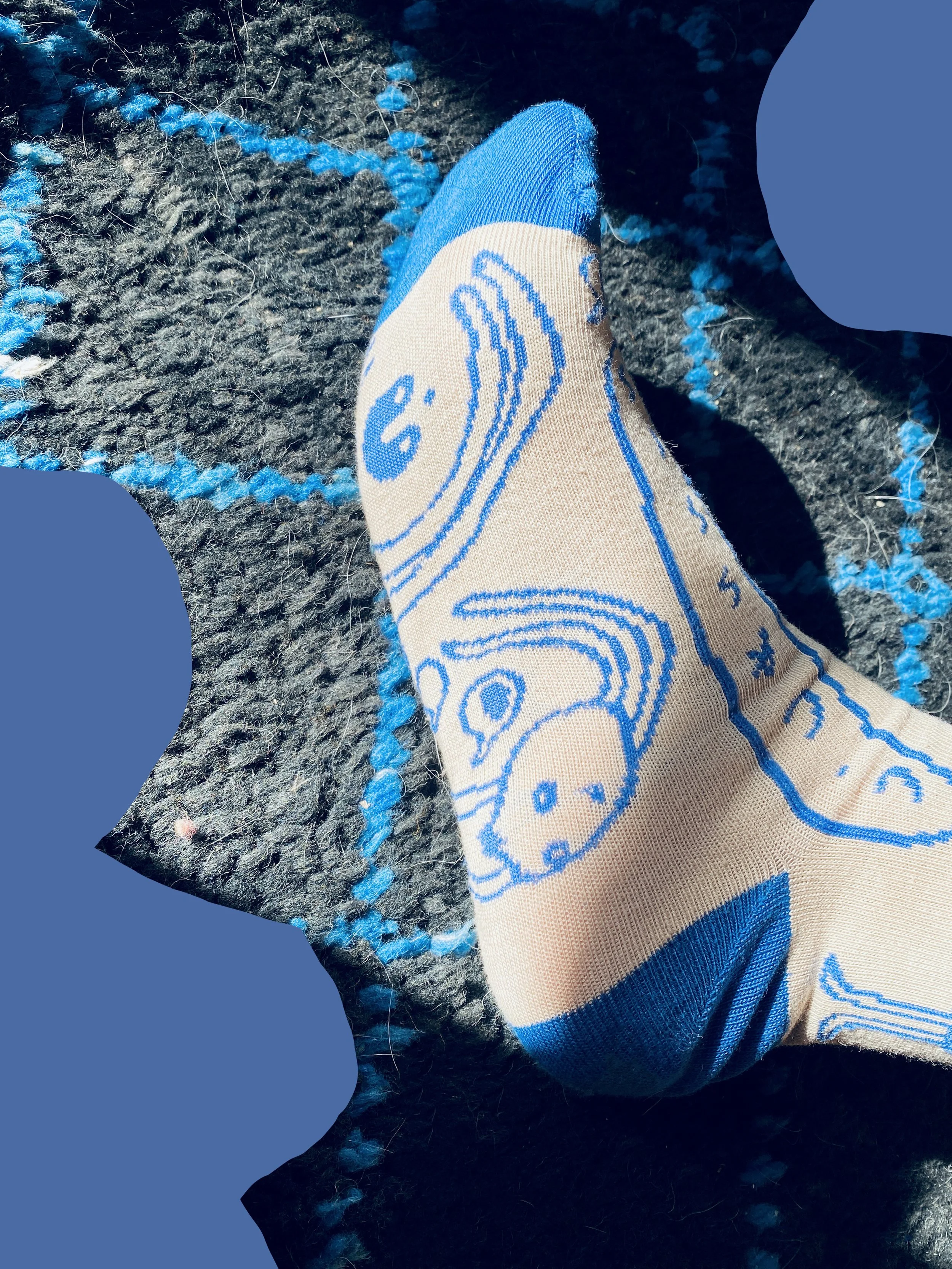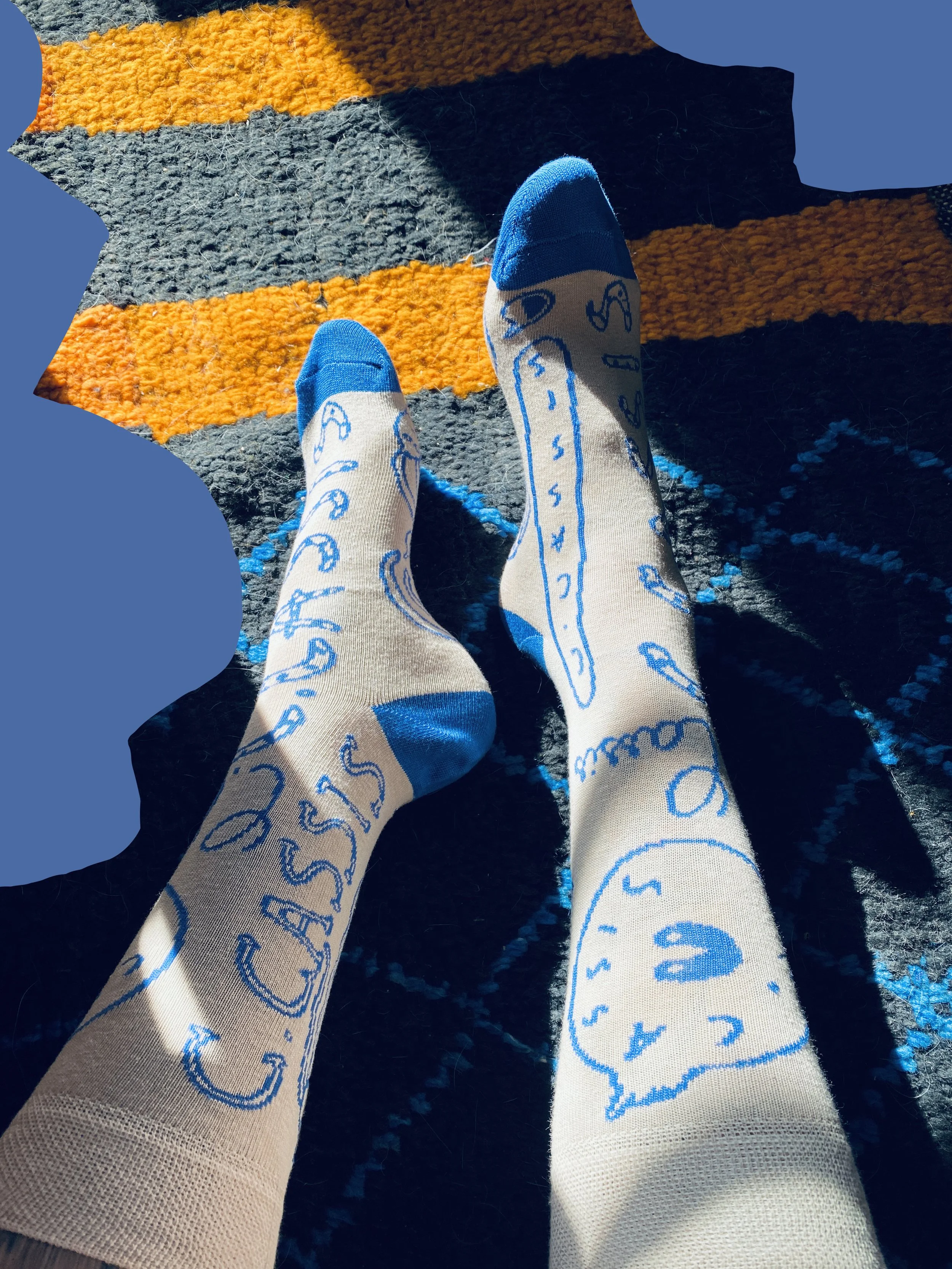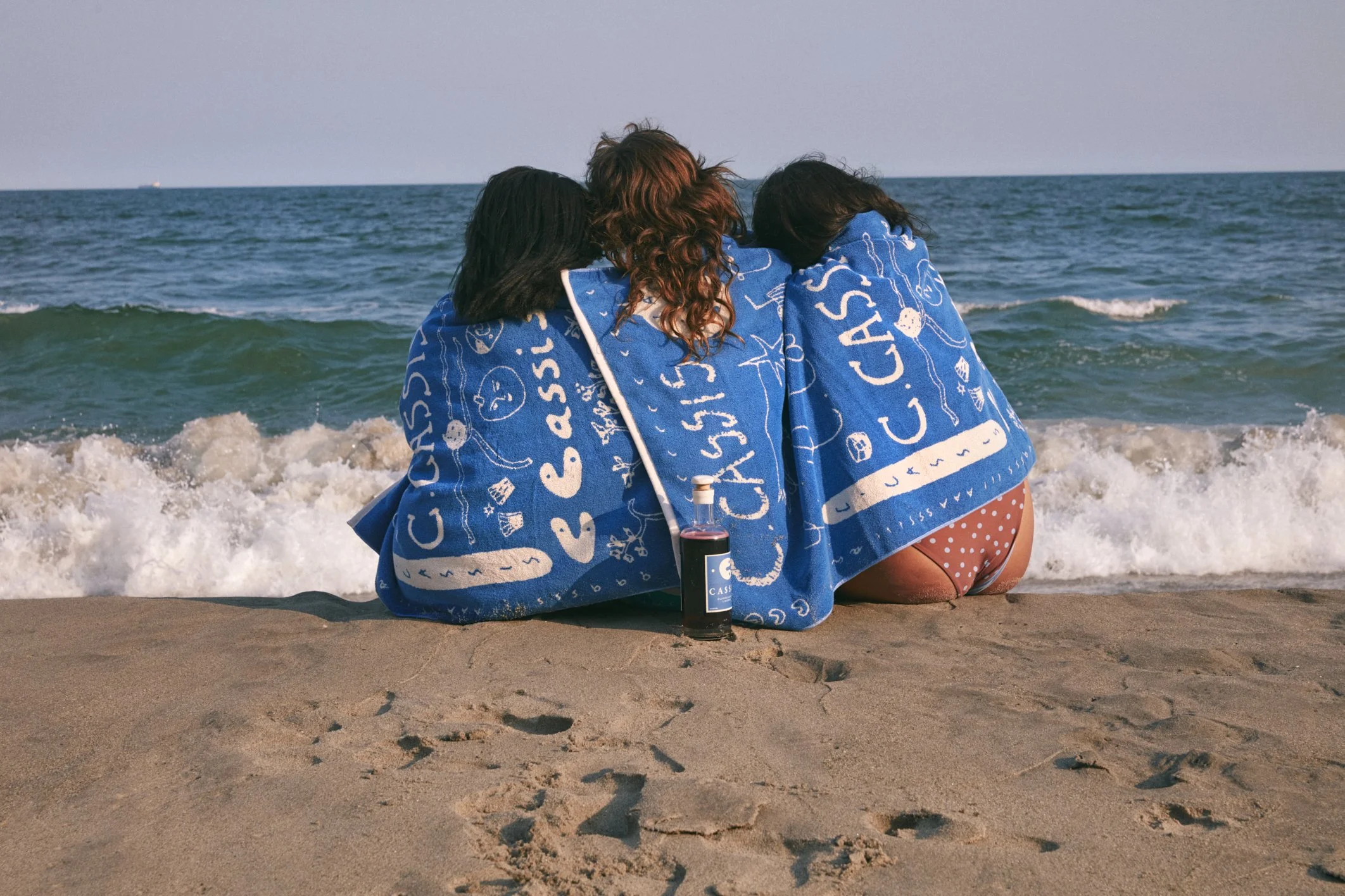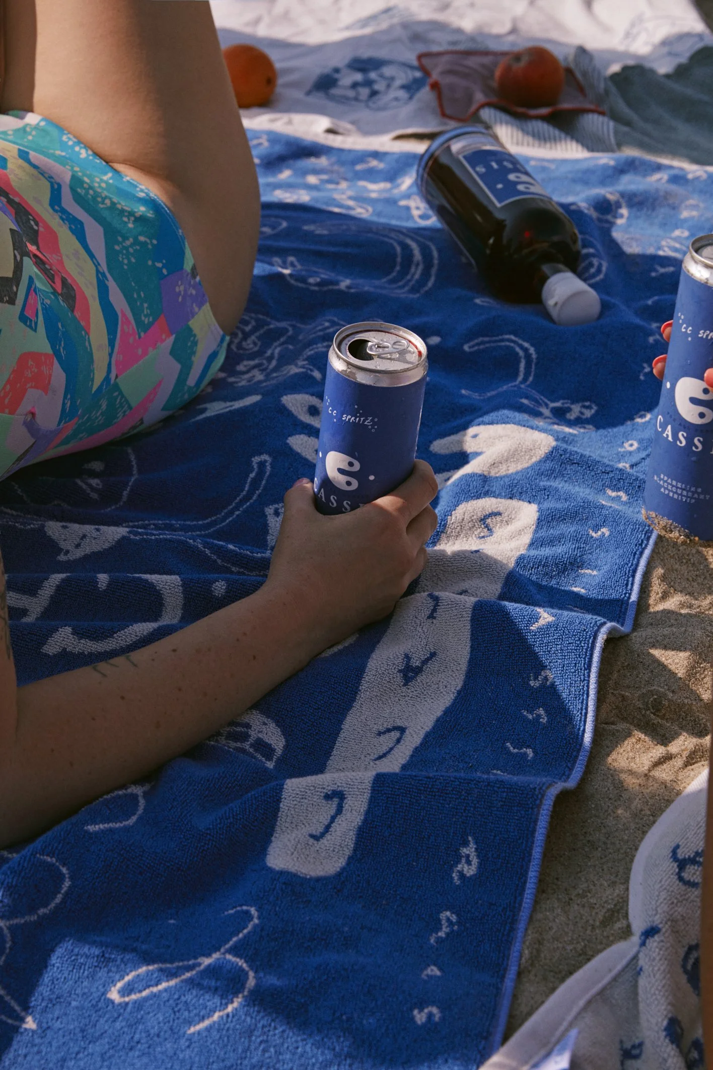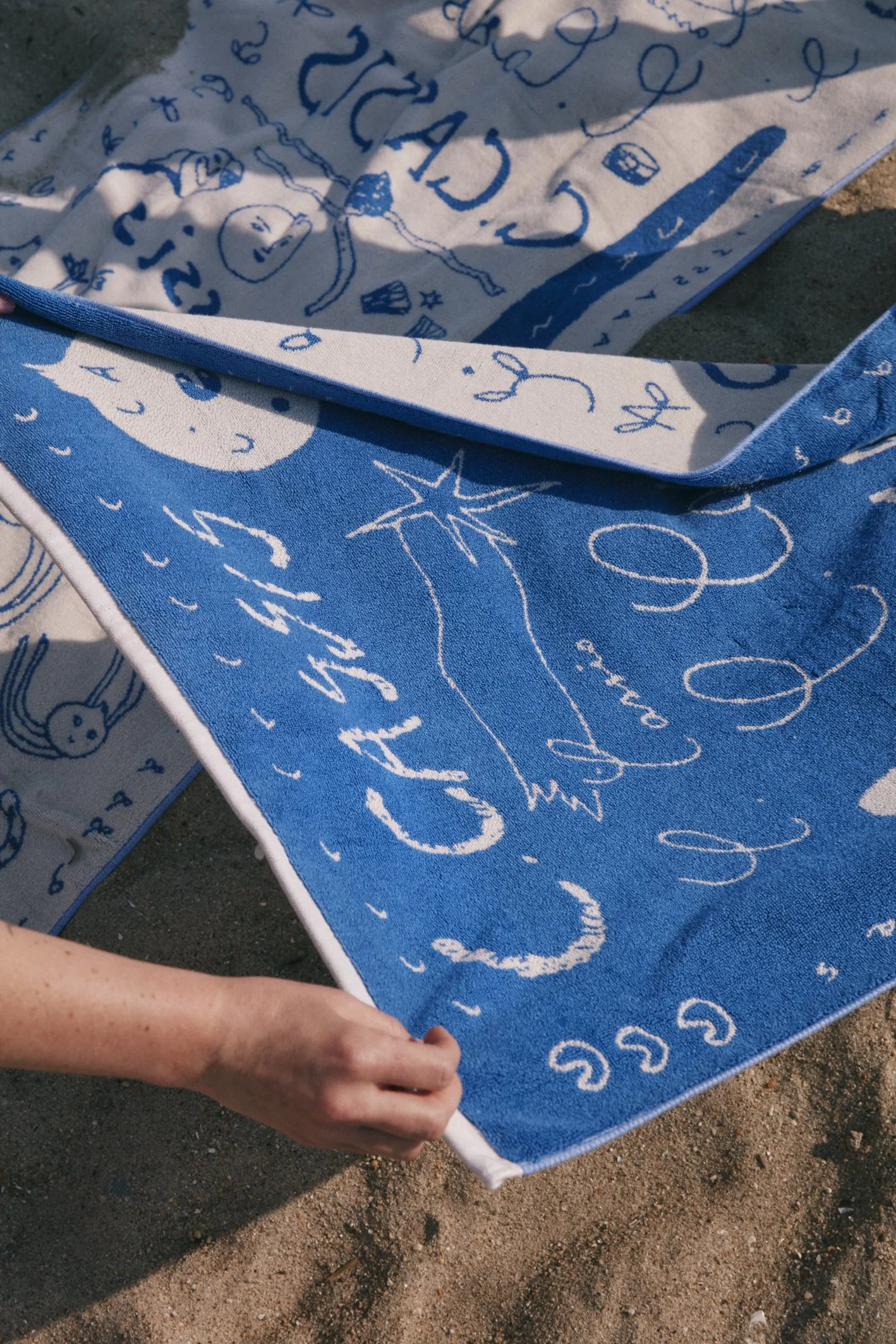 Super soft, cushy, limited edition loop woven plush towel featuring Philo Cohen signature hand-style lettering and illustrations in French Blue and Scour made in collaboration with Plunge Towels.
